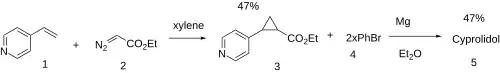 The cyclopropanation reaction between 4-vinylpyridine and ethyl diazoacetate affords ethyl 2-pyridin-4-ylcyclopropane-1-carboxylate. For steric reasons, the trans isomer is the thermodynamically favoured racemer, although epimerization may be needed to convert the cis isomer to the needed trans isomer. The Grignard reaction of two equivalents of phenylmagnesium bromide with the electrophilic ester completes the synthesis of cyprolidol.[6][7][8][9]