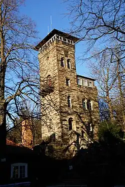 On the mountain there is a 23 m high observation tower[15] from the 19th century and a restaurant with a beer garden. The construction was applied for in 1850 by the forester Walde from Wuischke to the city council of Bautzen. First, the tower was built by Karl Traugott Eichler from Lauba according to the design of the architect Traugott Hobjan from Bautzen. This was completed on May 17, 1851 and opened in 1852 together with the inn. In 1856 a well was completed. The stone tower is the oldest of its kind in Upper Lusatia. In 1928 the tower was given a wooden structure, which burned down on December 19, 1944. Due to its proximity to Bautzen and the good infrastructure on the mountain, the summit of the Czorneboh is a popular destination.[16]