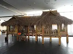 A Dai bamboo house is a type of stilt building primarily constructed of bamboo as the traditional form of housing for Dai people. The lower floor was about seven or eight feet high. Horses and oxen were hitched to the posts. There was a terrace near the upper stairs, which turned into a large long room. The rest of the house was a largely open space with a low roof, sloping on both sides, with eaves to the floor and, generally, no windows. If the eaves were slightly higher, there were small windows on both sides and a door on the back. In the middle of the building was a fireplace, burning day and night. The roof was covered with thatch and the doors and windows are made of bamboo. The construction is easy. It only took a few days to cut down bamboo and gather neighbors together to build it. These houses are perishable and had to be repaired each year after the rainy season. This construction method was conducive to damp roof, and drainage of rain suitable for topography of the PingBa area.