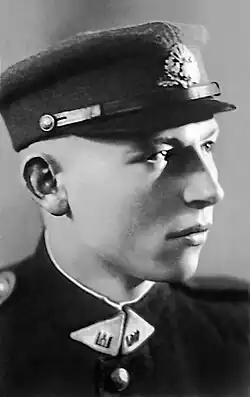 Danielius Vaitelis was born on 5 August 1913 in the village of Geležiai, then part of the Russian Empire. His parents, Petras Vaitelis (1866–1941) and Marcijona Vaitelienė née Šlikaitė (1884–1963) were peasants. Vaitelis was the youngest of two brothers and two sisters.[1] Vaitelis attended the Pagiriai primary school. He graduated from the Šėta middle school (progymnasium) in 1932. Vaitelis also briefly attended school in Kėdainiai. In 1933 he moved to Kaunas and began working at the Spindulys publishing house.[2] After graduating from a teachers' union gymnasium,[3] in 1935 he enrolled in the War School of Kaunas,[4] from which he graduated in 1938 with the rank of artillery lieutenant.[5] In 1939 Vaitelis completed aviation reconnaissance courses.[6][7]