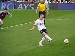 Fulham took over Murphy's Tottenham contract on 31 August 2007.[20] He cemented himself as a regular starter, kept his place in the team throughout the season and scored six goals in 43 matches. One goal, a rare header scored on 11 May 2008, gave Fulham a 1–0 win away at Portsmouth and ensured their Premier League survival.[21] Following the match, Murphy highlighted manager Roy Hodgson's "key role" in the team's avoiding relegation.[22] Murphy signed a new one-year contract, with an option for a further year, at the end of the season,[23] and was appointed club captain for the 2008–09 season.[24]