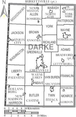 Map of Darke County, Ohio with Municipal and Township Labels