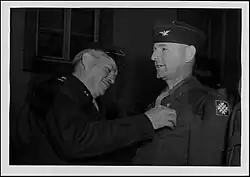 Barr (left) presents Colonel David C. Erksine with the Bronze Star Medal (1945)