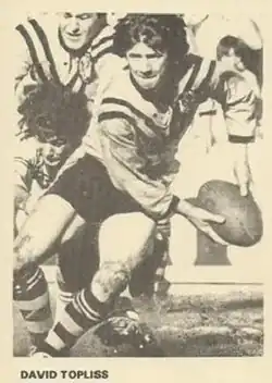 David Topliss (29 December 1949 – 16 June 2008) was an English World Cup winning professional rugby league footballer who played in the 1960s, 1970s and 1980s, and coached in the 1980s and 1990s. He played at representative level for Great Britain, England and Yorkshire, at club level for Wakefield Trinity (two spells) (captain), Penrith Panthers, Balmain Tigers, Hull FC (captain) and Oldham, as a stand-off.[1] and coached at club level for Wakefield Trinity.[2]