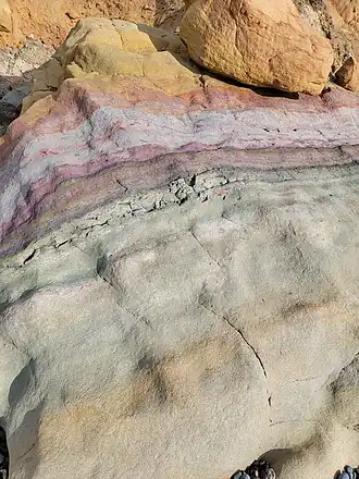The Delmar Formation is a geologic formation best exposed in seashore cliffs at Del Mar and Solana Beach in California, overlayed by Torrey Sandstone.[1] The formation rocks comprise the barrier bar[1] for Los Peñasquitos Lagoon[2] and have three sub-facies that can be classified as ancient oyster reefs (Ostrea idrianensis), tidal flats and sublittoral channels and ponds[1] The formation is a result of sedimentary infilling of a large Eocene Delmar lagoon[3] and contains fossils from that period. First identified as "Delmar Sand" by Hanna in 1926.[4] Frederiksen dates the formation as early Lutetian.[5]
