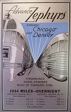 ![]() The Denver Zephyr in 1936 | |||||||||||||||||||||||||||||||||||||||||||||||||||||||||||||||||||||||||||||||||||||||||||||||||||||||||||||||||||||||||||||||||||||||||||||||||||||||||||||||||||||||||||||||||||||||||||||||||||||||||||||||||||||||||||||