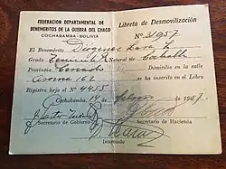 Record from Departmental Federation of Benemeritos of the Chaco War about Diógenes Lara