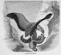 After the leporids, the next most significant group in the diet of golden eagles is the ground squirrels. They comprise about 11.2% of the prey taken by this species across the range. In areas where leporids are scarce, this group of rodents seems to become more prominent. In many parts of the golden eagle's range, ground squirrels are rare or absent, such as the British Isles, the Iberian Peninsula and some portions of central Eurasia. Nonetheless, about half of the large Spermophilus group, all species of prairie dog, three out of four species of antelope squirrel and nearly all the species of marmot have been found as golden eagle prey. Nests in Denali National Park in Alaska included, among a sampling of 690 remains, contained 84.2% Arctic ground squirrels (Spermophilus parryii).[32] Studies in Alaska have shown that the other major prey species in Alaska, the willow ptarmigan and the snowshoe hare, follow an 8 to 11 year population cycle. The locally abundant ground squirrels have less dramatic population variations and come out of hibernation in mid to late May (shortly after the eagles return from migration). The Alaskan Arctic ground squirrel appears to be eaten supplementally in peak years but then fill the primary niche when the ptarmigan and hare populations crash.[63][64] In Alberta, Columbian ground squirrels (Spermophilus columbianus) (occasionally supplemented by other species like yellow-bellied marmots) were the primary prey species, making up 84% of the diet of eagles nesting there.[27] In the French Alps, the most significant prey species is the Alpine marmot (Marmota marmota) at 68.9% out of a sampling of 198 from 6 nests.[65] This is also the main prey species in the Italian Alps above the tree line, comprising 49.7% of a sample size of 79 from 12 nests.[66] In the Caspian Sea area of Kazakhstan, yellow ground squirrels (Spermophilus fulvus) are the most important mammalian prey at 23.4% of a sampling of 468 from 36 nests.[67] Along Coastal California, California ground squirrels (Spermophilus beecheyi) replace black-tailed jackrabbits (which are scarce there) as the primary prey species.[68] In Washington, where the golden eagle inhabits mainly forest openings made by humans, the yellow-bellied marmot (Marmota flaviventris) is the main prey species, making up 41.8% of a sampling of 47 from 2 nests and 40.3% of a sampling of 315 from 74 nests.[44][45] In many other areas, ground squirrels are secondary prey, usually ranking after lagomorphs in dietary significance. This is especially true in the contiguous Western United States outside of Washington state and coastal California where they often register as second, third or even fourth most represented family by remains. Prairie dogs feature only as supplemental prey for breeding golden eagles but wintering eagles reportedly prey heavily on colonies of black-tailed prairie dogs (Cynomys ludovicianus).[69][70] Although rare, tree squirrels have turned up as prey in some eagle nests in both North America and Eurasia.[10][38]