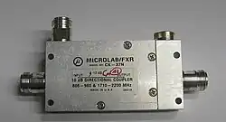 A 10 dB 1.7–2.2 GHz directional coupler. From left to right: input, coupled, isolated (terminated with a load), and transmitted port.