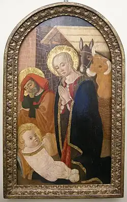 Domenico di Zanobi's paintings were first grouped together in 1966 by the American art historian Everett Fahy, who recognized about two dozen paintings in a similar style.[1][2] Since none of these paintings are signed, Fahy named their artist the "Master of the Johnson Nativity," after the panel of the Nativity in the Johnson Collection at the Philadelphia Museum of Art.[3] In 1996, the Florentine scholar Annamaria Bernacchioni identified this artist as Domenico di Zanobi, a documented assistant of Filippo Lippi in Florence and Prato, based on her discovery of the carpenter's bill for the Coronation of the Virgin at the Museo della Misericordia in San Miniato.[4] This painting, attributed by Fahy to the Master of the Johnson Nativity, was reportedly commissioned by the Chellini family in 1476 from a painter named "Domenico." Since the painting is clearly not by Domenico di Michelino, who also worked for the Chellini family, Bernacchioni suggests that it's by Domenico di Zanobi, who shared a workshop with Domenico di Michelino in Florence's Via delle Terme by 1467. The identification has since found acceptance among art historians.