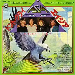 "Don't Cry" is the first hit single from progressive rock band Asia's second album Alpha. "Don't Cry" reached number 10 on the Billboard Hot 100 and number 9 in Cash Box magazine. It was the band's second top ten hit on the Billboard Hot 100 and returned them to number 1 on Billboard's Top Album Rock Tracks chart.
