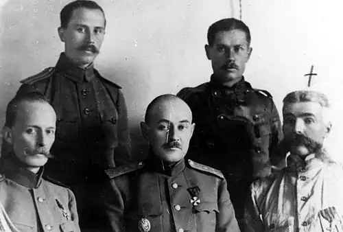 Don Army commanders. Back: Grigory Kislov, Vladimir Dobrynin. Front: Anatoliy Keltchevski, Vladimir Sidorin, Lt. Gen. Konstantin Mamontov. (After Mamontov died the photographer drew the cross above his head.)