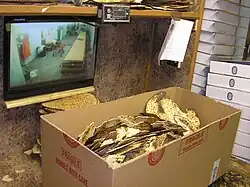 Overview of complete box of daily Challah yield at Boro Park Shmurah Matzah Bakery. Paper hanging at right is a request for the packer to pray for sick individuals as he performs the Mitzvah of separating the Challah from each basket.