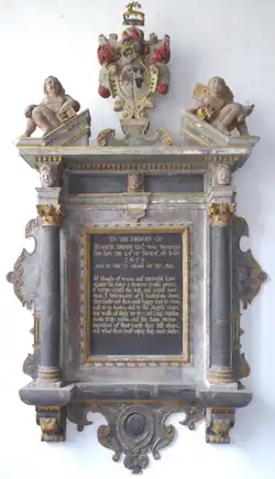 His mural monument survives in Broadhembury Church, erected after 1801 as requested in the will[29] of his eldest son and heir Francis Rose Drew (1738–1801), and displays a triple impalement: centre: (Ermine, a lion passant gules) Drew; dexter: (Sable, on a pale or three roses slipt leaved proper) Rose;[30] sinister: (Argent, a chevron between three lion's heads erased gules crowned or) Johnson. It is inscribed as follows (before much biographical details of some of his progeny):