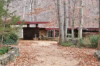 Wright designed this home in 1956 and named it "Laurel". This house is of the hemicycle design, and is built of irregularly coursed fieldstone. This single story house has a flat roof with curvilinear extensions and windows under roof extensions. The interior fireplace and hearth serves as dominant structural and aesthetic element. Typical of Wright designs, the home successfully blends with the surrounding wooded environment. The Dudley Spencer house is private and not accessible to the public. The house was built by its first owner, Dudley Spencer, over a five-year period between 1956 and 1961.