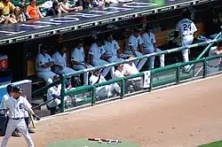 In baseball, the dugout is a team's bench and is located in foul territory between home plate and either first or third base. There are two dugouts, one for the home team and one for the visiting team. In general, the dugout is occupied by all players not prescribed to be on the field at that particular time, as well as coaches and other personnel authorized by the league. The players' equipment (gloves, bats, batting helmets, catcher's equipment, etc.) is usually stored in the dugout.