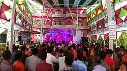 Durga Puja is celebrated in Bangladesh as a major religious festival, and it has a significant social impact on the society. This festival plays a vital role in communal harmony, cultural exchange, and economic activities.[30] Although Durga Puja is the festival of the Hindu community in Bangladesh, people from other religions, including Muslims, also participate in it. In many places during the Puja, Muslim neighbours help decorate the pandals and assist in organizing the festival. During Durga Puja, various cultural programs such as music, dance, drama, and decorative lighting are organized.