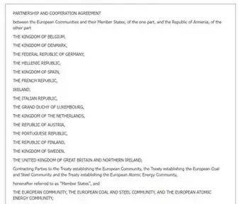 1. ^ a b Comprehensive and enhanced Partnership Agreement between the European Union and the European Atomic Energy Community and their Member States, of the one part, and the Republic of Armenia, of the other part