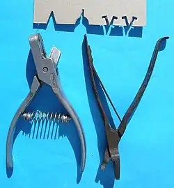 L-R: swallowtail, half halfpenny and slit; and double L earmarks with the earmarkers designed for sheep.