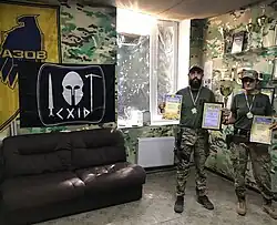Following the Russian invasion of Ukraine, it saw combat operations in Kharkiv Oblast. On 27 February 2022, they defended the police building in Kharkiv during the Battle of Kharkiv.[19] It also operated its own medevac service and evacuated wounded and disabled from the combat zone of Kharkiv Oblast.[20] Three soldiers of the company (Maksym Serhiyevich Volyk, Oleksandr Klushin and Tarusin Bohdan) were killed in combat on 2 March 2022.[21][22] On 16 March 2023, during the 2022 Kharkiv counteroffensive, they attacked Russian forces in Mala Rohan.[18] On 17 March 2022, they destroyed MTLBs and ATGM positions were destroyed and a large number of Russians were killed.[18] Another soldier of the company (Dmytro Kupriyanov) was killed in action on 18 March 2022.[21] Following the liberation of Mala Rohan and Vilkhivka, the company saw further engagements during the Eastern Ukraine campaign.[18]