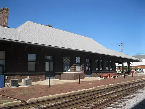 The Edgerton Depot is a historic railway station located at 20 South Main Street in Edgerton, Wisconsin. The station was built in 1906 to 1907 to serve the Chicago, Milwaukee, St. Paul and Pacific Railroad, also known as the Milwaukee Road; it replaced the city's original depot, which opened in 1853 with the railroad. Railroad engineer C.F. Loweth designed the station, which features a hipped roof, bracketed overhanging eaves, a red brick exterior with stone trim, and decorative brick quoins and keystones. The station was critical to the city's tobacco industry, which attracted customers from as far away as Europe; the railroad both shipped tobacco to larger cities and brought business agents to the city's firms. Passenger trains to the station, which were used both by residents and the aforementioned businessmen, primarily served routes to Milwaukee and Chicago. The station was remodeled in 1939, though rail travel in Edgerton had already begun to decline by this point; it fell even more significantly in the 1950s and 1960s, and the station closed in 1971.[3]