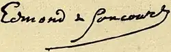 Edmond was known to be fascinated with Rococo and Japanese art.[7] He also collected rare books.[8] The brothers' house at Auteuil, which they purchased in 1868, was a showcase for their collection of 18th century French and Far Eastern art. Edmond documented the house and its interiors in his 1881 book La Maison d'un Artiste.[9] Between 1856 and 1875, the brothers published essays on 18th century art in a collected series called L'Art du XVIIIe siècle, which revived appreciation for the Rococo.[2]