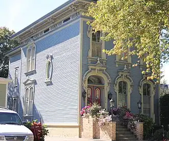 The Edward P. Ferry House is a narrow-front two-story Italianate structure with a hip roof on a brick foundation. The exterior has fanciful, Italian-inspired detailing about the main cornice, the west-side bay window, and the doorway and window openings. These details were likely added by Ferry some time after the house was constructed. The windows have round heads, and the front entrance is a double door arrangement with large panels of frosted glass in each door.[2]