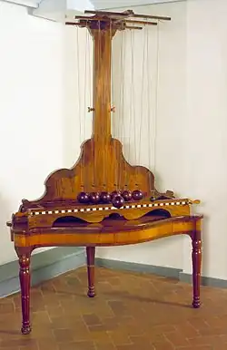It consists of a large frame carrying two beams from which two rows of six and two wooden balls, respectively, are suspended from pairs of strings. The instrument was often used with two elastic balls (of ivory) or inelastic balls (of wet clay), of equal or different mass. By changing the parameters of the experiments such as height of fall and mass, one could conduct a systematic investigation of collision-related phenomena. For example, when the row of balls is struck by one of the outermost balls, the row of balls remains motionless and the impulse is fully transmitted to the ball at the opposite end, which rebounds. As it falls back, the cycle continues in the opposite direction. This apparatus was illustrated by Jean-Antoine Nollet in Leçons de physique expérimentale (Paris, 1743–1748).[1] In his description, Nollet claims to have merely altered and developed a model previously used by Edme Mariotte. The most sophisticated devices for studying elastic and inelastic collisions were built by Willem Jacob 's Gravesande and Petrus van Musschenbroek.