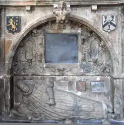 He died in 1635 and was buried in St. Andrew's Chapel (the "Cannons' Vestry") in Exeter Cathedral, as was also his wife when she died on 20 June 1636.[22] His elaborate monument with semi-recumbent alabaster effigy survives on the south side of the chancel in Bovey Tracey Church, opposite that of Nicholas Eveleigh, his second wife's first husband.