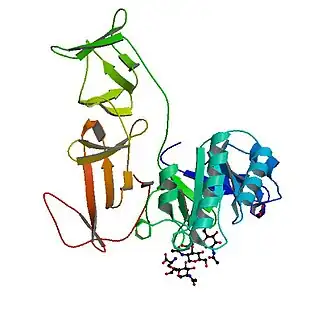 The cell-binding domain (CBD) binds to a specific substrate found in the host bacterium's cell wall, usually a carbohydrate. In contrast to the catalytic domain, the cell-binding domain is variable, which allows a great specificity and decreases bacterial resistance.[9] Binding affinity to the cell wall substrate tends to be high, possibly so as to sequester onto cell wall fragments any free enzyme, which could compete with phage progeny from infecting adjacent host bacteria.[10]