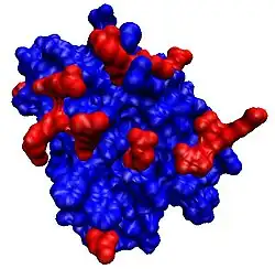 Human monomeric endostatin is a globular protein containing two disulfide bonds: Cys162−302 and Cys264−294.[12] It folds tightly, has a zinc binding domain at the N-terminus of the protein, and has a high affinity for heparin through an 11 arginine basic patch.[13][14][15] Endostatin also binds all heparan sulfate proteoglycans with low affinity.[16][17] Oligomeric endostatin (trimer or dimer) binds mainly with laminin of the basal lamina.[18]