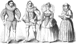 One of the main uses of costume during the Elizabethan era was to make up for the lack of scenery, set, and props on stage. It created a visual effect for the audience, and it was an integral part of the overall performance.[50] Since the main visual appeal on stage were the costumes, they were often bright in colour and visually entrancing. Colours symbolized social hierarchy, and costumes were made to reflect that. For example, if a character was royalty, their costume would include purple. The colours, as well as the different fabrics of the costumes, allowed the audience to know the status of each character when they first appeared on stage.[51]