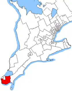 When the riding was recreated, it included all of Essex County except for Windsor, Old Tecumseh, St. Clair Beach, Leamington and Mersea Township.