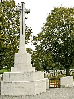 The cemetery was established next to a dressing station established by the Canadian Field Artillery during the Second Battle of Ypres, on farmland which was unnamed on pre-war maps; the dressing station was operational from early 1915 until 1918. The name "Essex Farm" commemorates the Essex Regiment, perhaps because a soldier of the 2nd Battalion of the Essex Regiment was an early interment there in June 1915. Twenty eight members of the 11th Battalion of the Essex Regiment were also buried there during 1916.[2] A monument in the cemetery commemorates the composition of the war poem In Flanders Fields which is reported to have been written in May 1915 by Lieutenant Colonel John McCrae MD, after witnessing the burial of his friend, Lieutenant Alexis Helmer, of the 2nd Battery, 1st Brigade Canadian Field Artillery, at Essex Farm; Helmer's grave is now lost.[3]