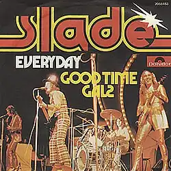 "Everyday" is a song by the British rock band Slade, released in 1974 as the second single from their fourth studio album, Old New Borrowed and Blue. It was written by lead vocalist Noddy Holder, bassist Jim Lea and his wife Louise Lea (uncredited), and was produced by Chas Chandler. It reached number 3 in the UK Singles Chart and spent seven weeks in the top 50.[1] The single was certified UK Silver by BPI in April 1974, only three days after its release.[2][3]