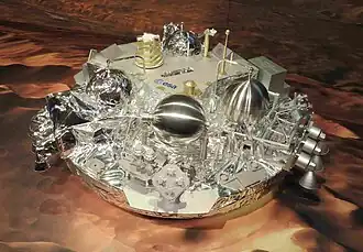 Model of the ExoMars Schiaparelli EDL Demonstrator Module (EDM). During its descent it returned 600 MB of data, but it did not achieve a soft landing.[65]