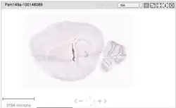 A search was performed on the Allen Brain Atlas using FAM149A. According to the levels of expression provided by the Atlas, FAM149A is not expressed in notable levels within the mouse brain. However, with visual observation of the figure, FAM149A could be found in the ventral posterior complex of the thalamus. This can be seen as the dark vertical line in the center of the sagittal brain slice in the image below. As a comparison, the expression of the protein, actin, is used to demonstrate what a mouse brain appears like with high levels of expression.[14]