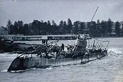 The K-12 was a 611-ton ex-submarine of the Royal Netherlands Navy (later the United States Navy) that was bought by private buyers after World War II and leased to the Port Jackson & Manly Steamship Company, who set her up as a museum ship at a custom berth adjacent to Manly harbour pool.[7] When storms struck in June 1949, an attempt was made by her owners to tow her to a safer berth in Neutral Bay, however the tow ropes broke, and the submarine grounded on rocks near Fairlight Beach.[8] The hull was lightened by salvagers then re-floated on 7 January 1951,[9] and towed up the Parramatta River to Ryde Road bridge; however here she sank again after her seacocks were vandalised. Some sources say that the engines and sections of the bow remain in Fairlight and are accessible by scuba divers.[10] However, they are the remains of a large aluminium speedboat that got blown by high winds and sunk on the night of 7 January 1952.[11][12][13]