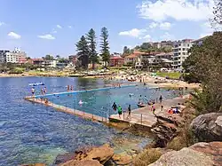 Fairlight Beach is located on the Manly Scenic Walkway[6] on Sydney Harbour, which can be followed for some kilometres (miles) to Spit Bridge. The beach experiences light harbour swells and southerly winds. Though swells up to 2 metres (6.6 ft) were recorded following Hurricane Larry, it is not a surfing beach, as the shore is rocky and the break unpredictable. The beach has sand largely made up of shell grit (largely missing from the beaches on either side), and a small tidal swimming pool.