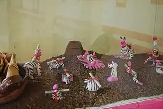 The sets consists of twelve small figures, between five and eight centimeters high, small enough to be fired on a comal, with a pot covering it to make a kind of small oven.[1][2] There are two kinds of sets, one for children and one for adults. In both, the pieces are painted white, with pink faces, with red lines on the sets for children and black lines on the sets for adults.[1][3] Both are painted in enamels and the stripes have diamond points. The use of red and black for age is of Mesoamerican origin, relating to the position of the sun.[1][2] The sets include two human figures, one on a mattress or petate with represents the sick person and another which represents the healer, which has a dove in his/her hands.[3] Another piece is that of a dove, which also serves as a whistle. The other nine pieces are those of animals considered harmful such as a snake, a millipede, a lizard, a tarantula, a spider, a frog, a coyote, a scorpion and a bull.[2][3] The bull is a later addition, since it was introduced by the Spanish, who in stories often related it to the devil.[1]