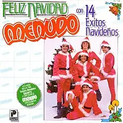 Feliz Navidad (official title including subtitle: Feliz Navidad — Con 14 Éxitos Navideños) is a compilation album released by the Puerto Rican group Menudo in 1983 under the label Profono Internacional.[1] The tracklist features fourteen songs previously released on two of the group’s Christmas-themed studio albums: ¡Felicidades! (1979) and Es Navidad (1980), both originally released by Padosa Records.[2][3] The LP includes a colorful 12" x 12" Christmas card printed in four colors, featuring a holiday greeting from the quintet.[4]