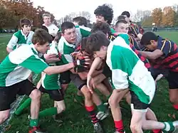 An U16 rugby match at Finborough School, the Finborough team is in red and blue.