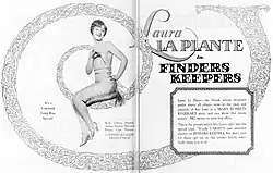 Finders Keepers is an extant 1928 American silent military comedy film directed by Wesley Ruggles and Otis B. Thayer and starring Laura La Plante and John Harron.[1][2] Due to the public apathy towards silent films, a sound version was prepared late in 1928. While the sound version has no audible dialog, it features a synchronized musical score with sound effects using both the sound-on-disc and sound-on-film process. It was produced and distributed by Universal Pictures. The film may or may not be a remake of a 1921 film Finders Keepers singularly directed by Thayer.