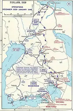 The aim of the invasion was to liberate the 'Red Finns'[1][8] and eventually annex Finland to the Soviet Union.[9] To this end, a puppet government, the Finnish Democratic Republic, was established in Terijoki under the leadership of the exiled O. W. Kuusinen.[10] Strategic goals of the Red Army included cutting Finland in half and capturing Petsamo in the north and Helsinki in the south.[11]