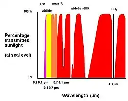 The sun emits an enormous amount of energy, which would be harmful to human beings if not for the vapours and gases in the atmosphere, like water (clouds), ozone, and others, through which the sunlight is filtered. In the figure it can clearly be seen that "cold" CO2 filters the solar radiation around 4.3 μm. An Infrared detector which uses this frequency is therefore solar blind. Not all manufacturers of flame detectors use sharp filters for the 4.3 μm radiation and thus still pick up quite an amount of sunlight. These cheap flame detectors are hardly usable for outdoor applications. Between 0.7 μm and approx. 3 μm there is relatively large absorption of sunlight. Hence, this frequency range is used for flame detection by a few flame detector manufacturers (in combination with other sensors like ultraviolet, visible light, or near infrared). The big economical advantage is that detector windows can be made of quartz instead of expensive sapphire. These electro-optical sensor combinations also enable the detection of non-hydrocarbons like hydrogen fires without the risk of false alarms caused by artificial light or electrical welding.