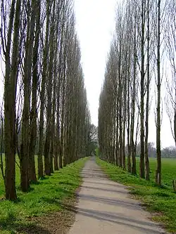 An avenue of poplar trees through Fletcher Moss eventually turns into a path by the River Mersey