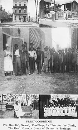 The hospital began as the Phyllis Wheatley Sanitarium and Training School for Negro Nurses and was run by the Phyllis Wheatly Club.[4][5] It was the first black hospital in the South.[2] The training school included hospital care and was founded in 1896,[4] operating under the administration of the Phyllis Wheatley Club and located in the Medical College facility of New Orleans University, which was run by the Methodist Episcopal Church.[2] Needing increased financing to maintain the hospital and because of a lack of financial support, the school was taken under the wing of New Orleans University and merged with the school's Medical College hospital.[5] The efforts of Methodist Episcopal Church Bishop Willard Francis Mallalieu, the school was able to enlist the aid of John Flint of Fall River, Massachusetts, who donated $25,000 to the institution.[4] Flint lobbied Caroline Mudge of Boston to donate money to buy a building for the hospital.[2] In 1901, the name of the hospital was changed to Sarah Goodridge Hospital and Nurse Training School and the name of the medical college to Flint Medical College of New Orleans University, in honor of John Flint.[5] Flint donated an additional $10,000 to purchase a new property at 1566 Canal Street, which would house the Flint Medical College.[4] From 1901-1911, it graduated a total of 164 physicians and pharmacists.[2]