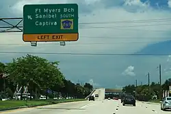 The historic southern terminus of SR 865 is an interchange between Interstate 75 (I-75 or SR 93) and Bonita Beach Road in Bonita Springs, though the current county designation actually begins 2.2 miles (3.54 km) east of the interchange near Logan Boulevard.[3][4] From there CR 865 follows Bonita Beach Road westward through Bonita Springs to Hickory Boulevard on Bonita Beach (Little Hickory Island), near the Gulf of Mexico shore. Motorists traveling north then cross the Bonita Beach Causeway, which passes over Big Hickory Island, Long Key and Black Key, which provides access to the Lovers Key / Carl E. Johnson State Park. Once on Estero Island, CR 865 is known as Estero Boulevard and passes through the island town of Fort Myers Beach before connecting to San Carlos Boulevard on the north end of the island. State maintenance begins the intersection of Estero and San Carlos boulevards just east of Bodwitch Point Park. After crossing the Matanzas Pass Bridge and San Carlos Island onto the mainland, SR 865 forms the western boundary of Estero Bay Preserve State Park adjacent to Hurricane Bay.