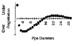 The general indications are that the conventional tube bundle will cause the orifice installation to over register flow values up to 1.5% when the tube bundle is 1 pipe diameter to approximately 11 pipe diameters from the orifice plate. This is caused by a flat velocity profile that creates higher differential pressures than with a fully developed profile. There is a crossover region from approximately 10 to 15 pipe diameters where the error band is approximately zero. Then a slight under-registration of flows occurs for distances between approximately 15 to 25 pipe diameters. This is due to a peaked velocity profile that creates lower differential pressures than a fully developed profile. At distances greater than 25 pipe diameters the error asymptotes to zero. Fig.(3) showing the Conventional Tube Bundle Performance explaining typical characteristic behavior of the popular 19 tube, tube-bundle. An additional drawback of the conventional 19 tube, tube bundle is variation in sizing. The conventional tube bundle provides errors very much dependent on installation details, that is, the elbows on and out of plane, tees, valves and distances from the last pipe installation to the conditioner and conditioner to the orifice plate. These errors have a great significance. Therefore, the latest findings regarding conventional tube bundle performance should be reviewed prior to meter station design and installation. The final installation option for orifice metering is perforated plate flow conditioners. There is a variety of perforated plates have entered the market. These devices generally are designed to rectify the drawbacks of the conventional tube bundle (accuracy and repeatability insufficiency). The reader is cautioned to review the performance of the chosen perforated plate carefully prior to installation. A flow conditioner performance test guideline should be utilized to determine performance.[11] The key elements of a flow conditioner test are -