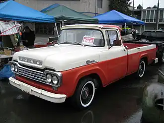 The third-generation of the Ford F-Series is a series of trucks that were produced by Ford from 1957 until 1960. Following its competitors at Dodge and General Motors, Ford widened the front bodywork to integrate the cab and front fenders together. Going a step further, the F-Series integrated the hood into the bodywork with a clamshell design;[1] the feature would stay part of the F-Series for two decades. Although offered previously, the optional chrome grille was far more prominent than before. In the rear, two types of pickup boxes were offered, starting a new naming convention: the traditional separate-fender box was dubbed "Flareside", while "Styleside" boxes integrated the pickup bed, cab, and front fenders together. As before, Ford still offered a low-GVWR version of each model.